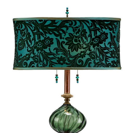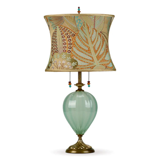 Kinzig DesignsOriginal price $1,130 - Original price $1,130Original price$1,130$1,130 - $1,130Current price $1,130| /Elaura Lamp by Kinzig DesignElaura is a stately lamp with sea foam blown glass matched with a corset drum shade covered with silk fabric with an ab...