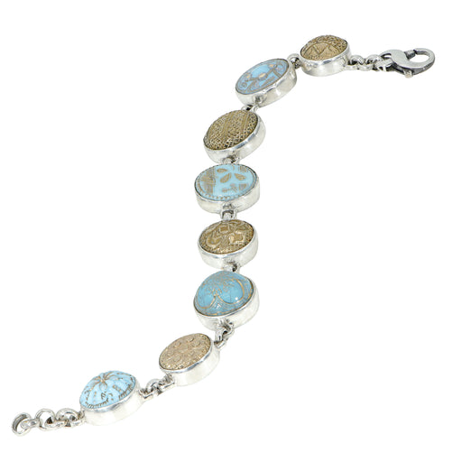 Elizabeth NgoOriginal price $410 - Original price $410Original price$410$410 - $410Current price $410| /Antique Blue & Gold Button Bracelet by Elizabeth NgoOne of a kindAntique buttons date back to the Victorian EraSet in sterling silverMeasures 7...