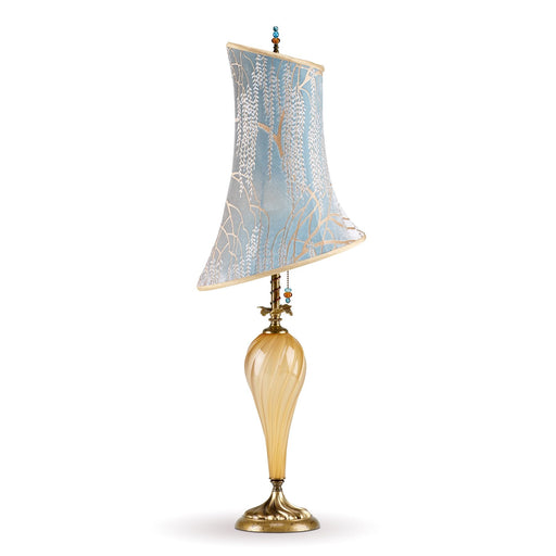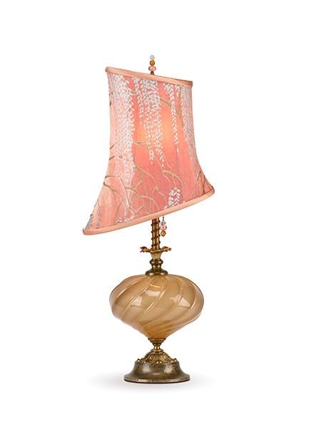 Kinzig DesignsOriginal price $1,040 - Original price $1,040Original price$1,040$1,040 - $1,040Current price $1,040| /Andrea Table Lamp by Kinzig Designs Swirling Gold Glass Base Asymmetric Shade covered with hand painted "Willow" fabric designed by Kevin O'Brien...