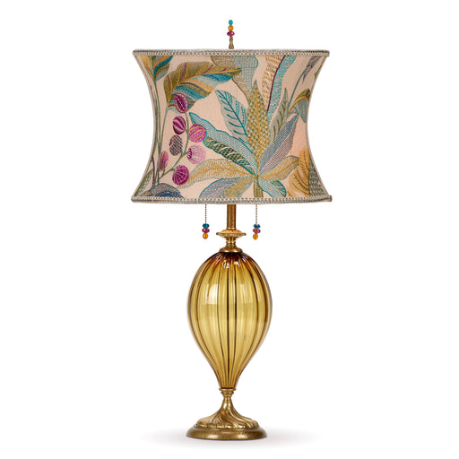 Kinzig DesignsOriginal price $1,130 - Original price $1,130Original price$1,130$1,130 - $1,130Current price $1,130| /Anna Lamp by Kinzig Designs Anna has amber/gold colored blown glass with a tall corset drum shade. The shade is covered in an embroidered botanica...