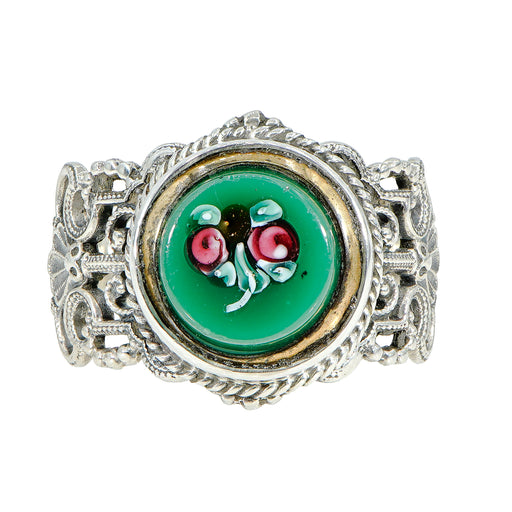 Green Rose Antique Button Ring by Elizabeth NgoGreen glass button ring with hand painted rosesButton dates back to the Victorian EraSet in sterling...