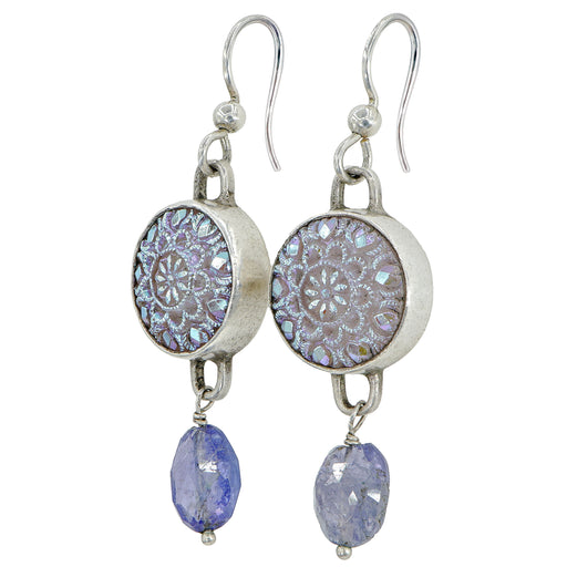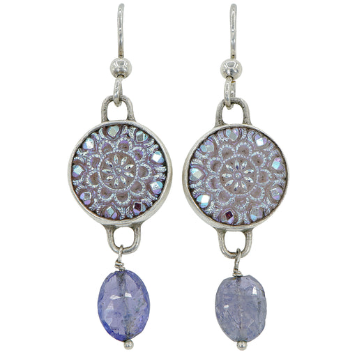 Lavender Luster Glass Button Earrings by Elizabeth NgoAntique iridescent Czech glass button earringsSet in sterling silver with amethyst stone drop...