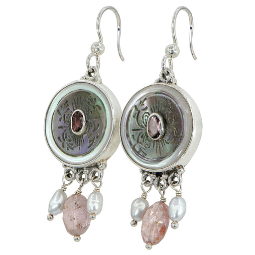 Pink Victorian Carved Pearl Button Earrings by Elizabeth NgoCarved pearl & shell button Amethyst and pearl accentsSet in sterling silver2" long