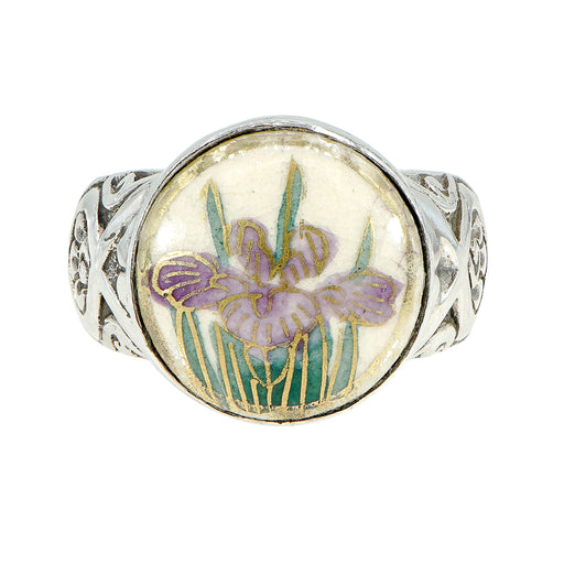 Orchid Satsuma Antique Button Ring by Elizabeth NgoHand painted porcelain antique button with purple orchidsSet in sterling silverSize 7.5