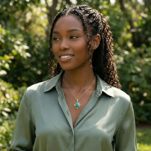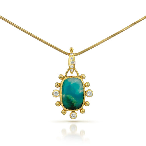 Q EvonOriginal price $3,400 - Original price $3,400Original price$3,400$3,400 - $3,400Current price $3,400| /14k Gold Gem Silica and Diamond Pendant Necklace by Q Evon One-of-a-kind Rare Ray Mine Gem Silica 15 x 10mm cabochon (4.2 tcw) Handcrafted in 14k...