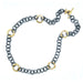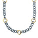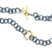 A modern classic necklace composed of linked handmade rings of oxidized silver and gold. The large gold rings and toggle clasp add a touch of elegance and brightness.