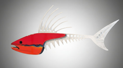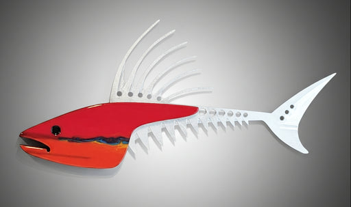 • A wall-mounted sculpture of a red and white fish with a fiery-red metal design and surf-inspired stripe, crafted from aluminum, maple, and epoxy.