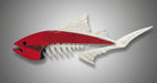 Inspired by the bluefin tuna, this smaller version of the Big Fin wall sculpture captures its essence with a contemporary design. Brilliant red blues flow across the surface with a color-blend stripe, allowing the natural beauty of the wood grain to shine through. The body is crafted from soft maple, a hardwood sustainably harvested in the USA. It features brushed aluminum accents alongside non-toxic resin. Each piece showcases a unique color pattern, ensuring no two sculptures are alike. Measures 29.5" x 9.5" x 1.5", hanging hardware included.