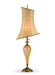 Alessandra is a stately lamp, hand made with opaque gold blown glass and coiled copper around the neck of the lamp. Its unique, asymmetric shade is covered with a sheer burned out silk with a green leaf design. It has a beaded pull and a beaded finial. Alessandra has a single bulb socket.Measures 36" T: Shade measures 14" wide, 8" deep, 18" tall